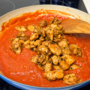 Pour in the tomato sauce and sugar. Let it simmer for 2-3 minutes to deepen the tomato flavor. Now, slide your cooked chicken back into the skillet.